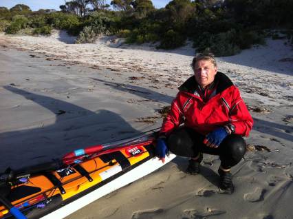 Hi All, well that’s it; the big crossing is done. Arrived on Tasmania’s shore today around 4.30pm(EST), to be greeted by my wife Annie, Mal Hamilton & his daughter Donna. The crossing of Banks Strait from Rebecca Cove on Clarke Island to Little Mussleroe Bay on Tassie, went well with the strong currents and 4mtr swell muddled in with a 2mtr constant wind wave and 20knots of wind, just to keep me on my toes. My little make shift compass spent most of the day pointing in the wrong direction as it has done since having my good Silva compass smashed at the beginning of the expedition. I shall be writing a very stern letter of complaint to Garmin since my good GPS the Garmin 78sc decided to die completely as I was about a mile out to sea on the start of the long ocean crossings many days ago. No compass and a stuffed GPS makes for a lot of guess work. I did carry my spare Garmin 78s which constantly shuts down. Oh what fun!!!