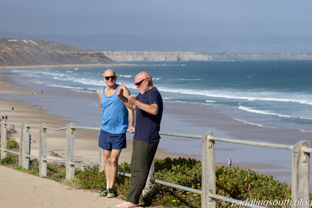 I peered over the railing to see some nice wave sets barreling in towards the shore. A great day for a couple of old salty dogs to get in a little exercise and maybe a few thrills in the surf. Out the back there was large rideable waves, but first we would have to paddle the “Shore Break”. Today it was thumping into only 40cm of water on the sandbar and was just waiting to crush any mistakes;  grinding you into the sand as well as flushing through every orifice.