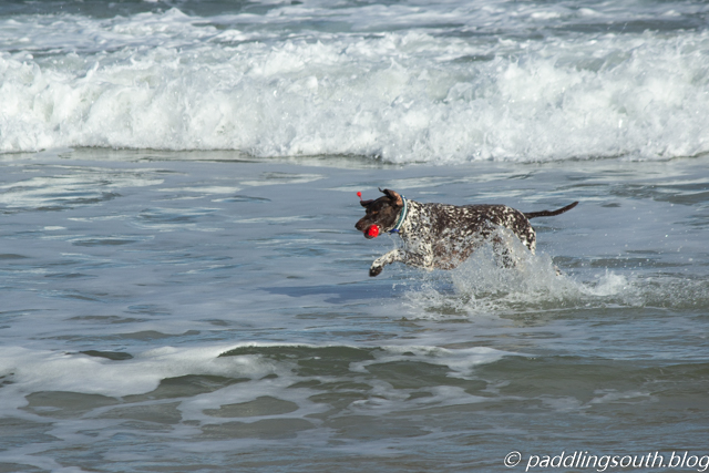 It’s just us and a crazy dog braving the ocean today.