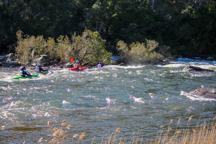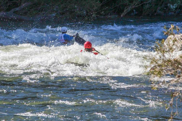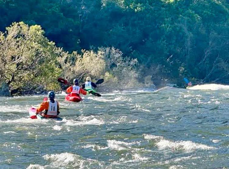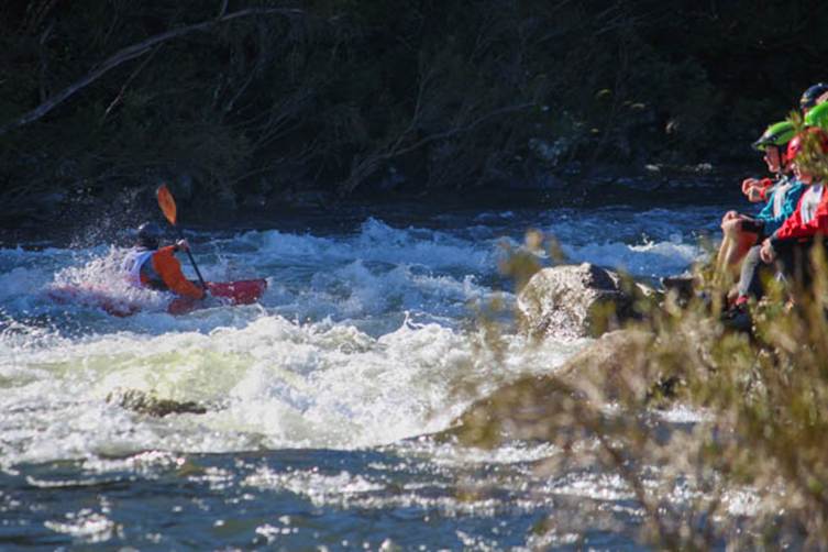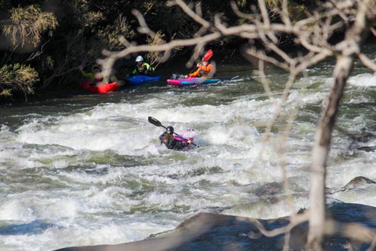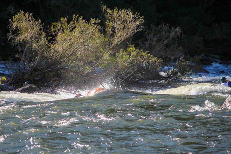 The format was 4 or 5 paddlers starting together up stream of the main rapid, finding their way down the course to touch a banner attached to a rock at the bottom. Sounds easy enough, except the bit about getting down the rather pushy Grade 3 rapid in one piece.