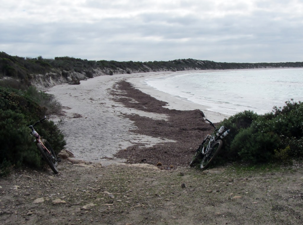 And then I had an unplanned dismount when I startled 2 Emus who bolted in front of me. Things got a little interesting with 200 kg of bird flashing across the handle bars. The track ended at McLarens Beach, another perfect and deserted destination.