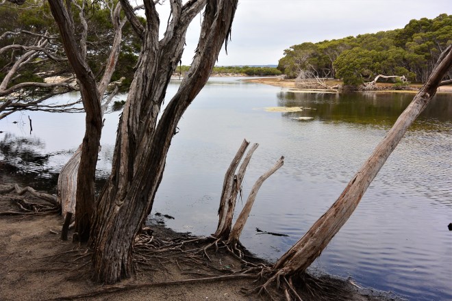 The camp was located inland a few hundred metres on the banks of the Chapman River, however on such a low tide the mouth was closed and a portage was required.