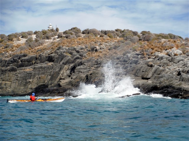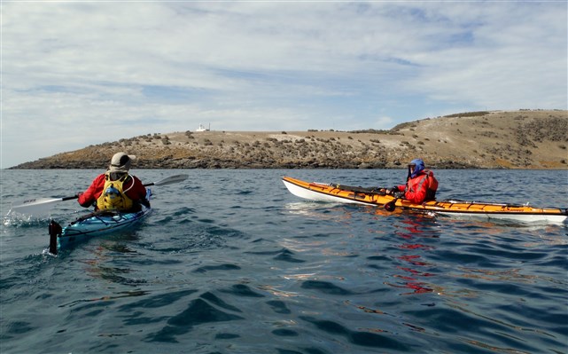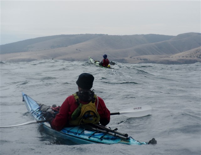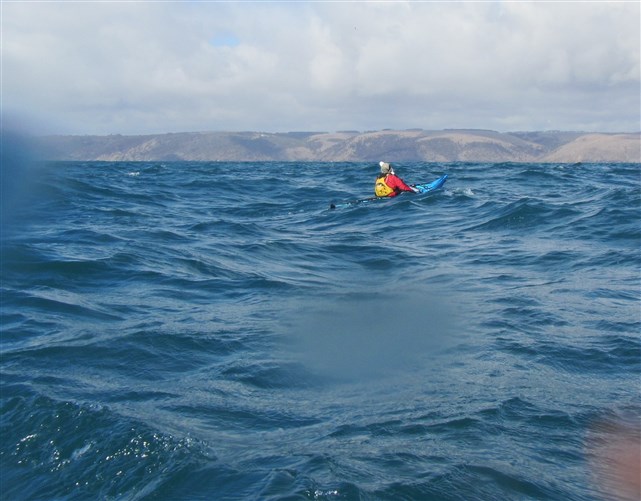 Fortunately our meeting with the Scraper was in very different weather conditions. We had decided to paddle across Backstairs Passage, which is a particularly turbulent stretch of water dividing Kangaroo Island from the mainland. Conditions are made interesting by a 3kn tidal current being squeezed through the Passage as well as the Yatala Shoals, although the Autumn neap tide suggested calmer seas.