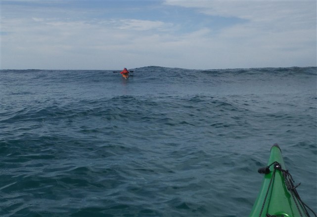 We were able to use the side sea  to our advantage, often catching small runs that picked up the laden kayaks. The crossing took 2hr 15m and was generally uneventful except for a few waves that pitched up suddenly and landed a ton of water on your shoulder. It’s also a little difficult taking photos in these conditions, so please excuse our defects.