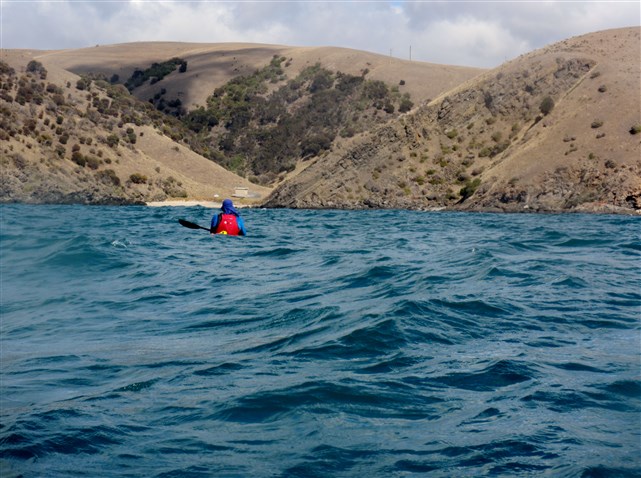 We packed and portaged back into Antechamber bay where conditions were as expected, being at the bottom of Beaufort Wind Scale around 4, meaning “smaller waves, becoming larger; numerous whitecaps”.  Our heading would take us within 1 nautical mile of the Yatala Shoals so I knew from experience that the waves would be quite steep and confused where the tidal rips collide.