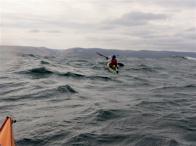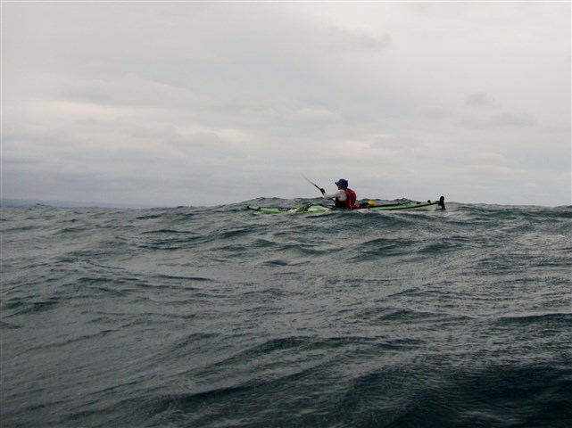 No mistakes; no miscalculations; extreme caution was in order as getting caught in the wrong place or the wrong tidal stream can mean being swept southwards. Michael and I had done this crossing many times in various conditions but it was Rodney’s first crossing. He had been putting in many hours training in the kayak, not only doing endurance work but lots of sessions paddling the coast in windy, sloppy conditions combined with many sessions handling large surf waves.