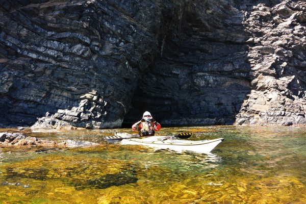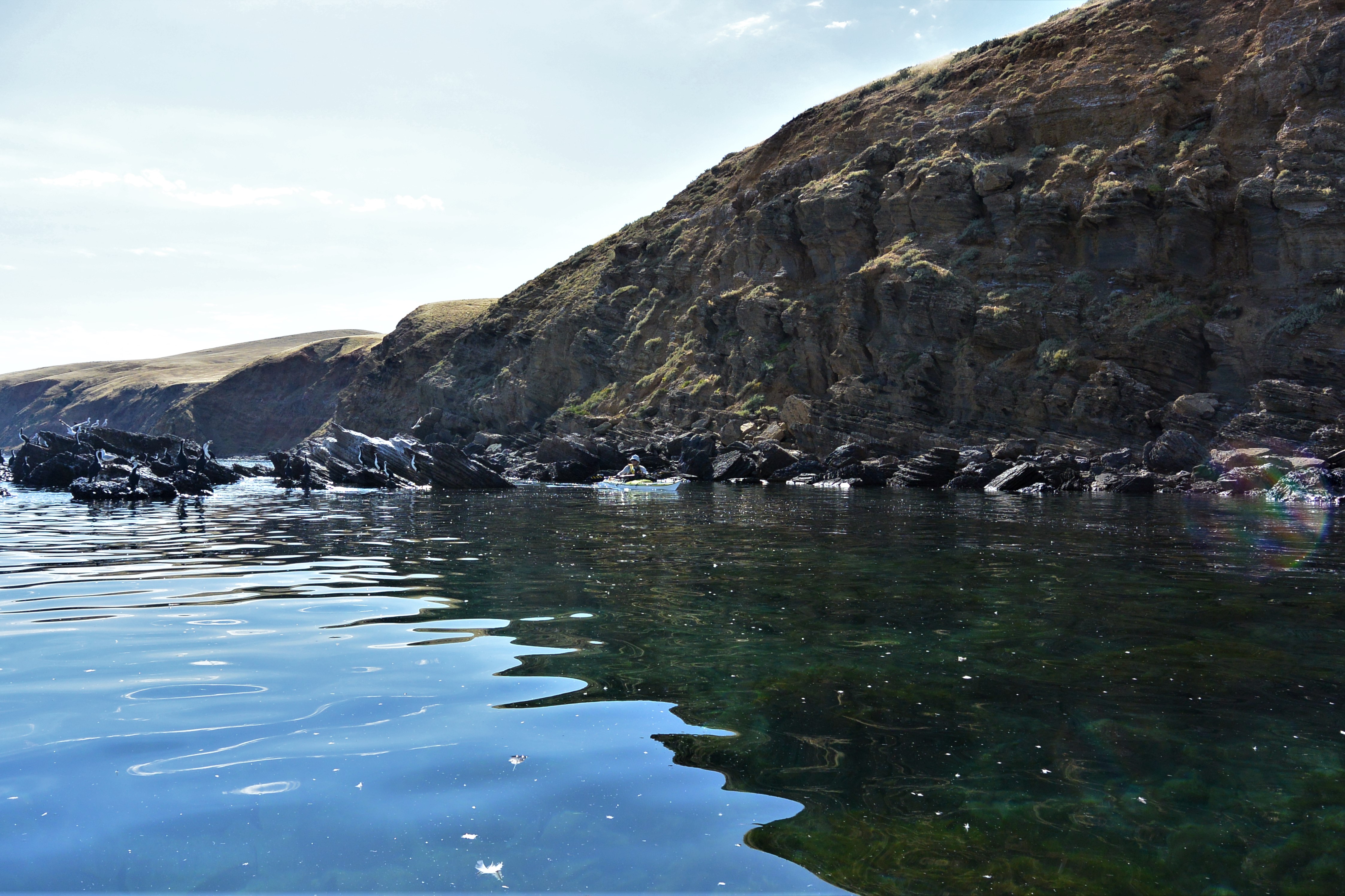 We awoke to a hot and still morning. With no wind and clear blue skies we quickly unloaded the kayaks and paddled off to explore Smoky Bay.