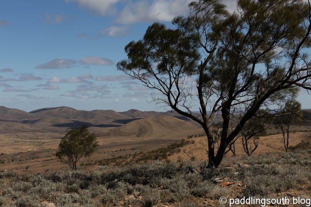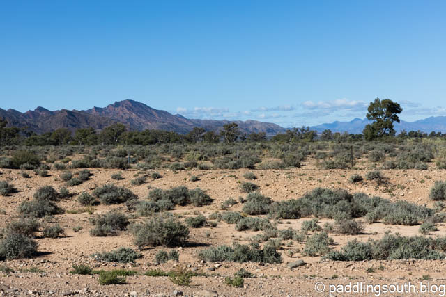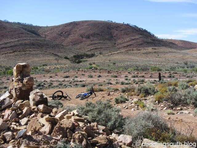 Our first ride was on the Old Beltana Road which is a rocky, red dirt road that heads north for 20km, emerging through the Puttapa Gap, before joining the highway. Recently, Cyclone Ilsa pushed a rain band south from the tropics giving the area a good drink. We saw only a small amount of surface water in the creeks and the red clay roads were dry and hard.