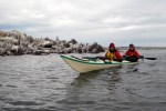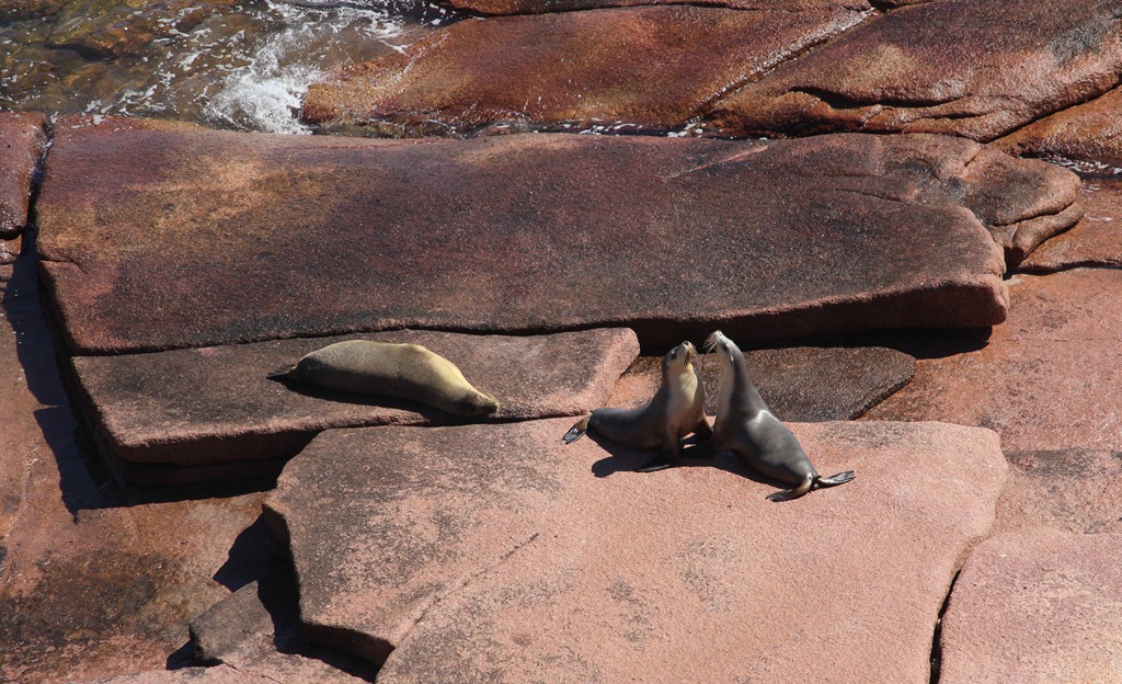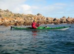 Our time exploring was cut short as the wind threatened to further increase off shore. We made a perfect departure from the protected beach timing our breakout perfectly to avoid the shore break. The run back to camp was fast and furious sliding down a following sea and occasional breaking waves to arrive at the protection of the north tip of the islands. The north tip is home to a colony of Sea Lions and a large number of Pied Cormorants who inhabit the rocky outcrops so it was relaxing to hide in the lee and enjoy the antics of the locals.
