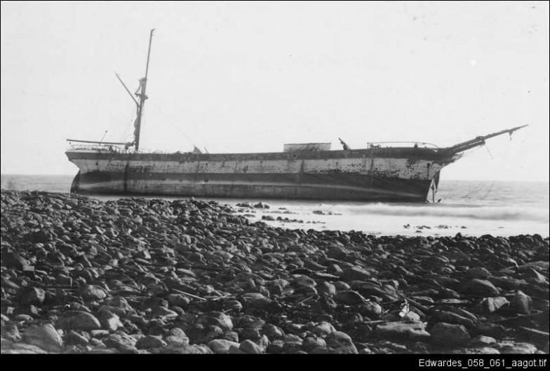 The Aagot, an iron Barque of 1242 tons, built at Glasgow, 1882, as the Firth Of Clyde, but now laying on rocks on Wardang Island. A gale on 11 October 1907. wrecked the ship in rough seas and imprisoned the crew on board until the ebb tide moderated conditions and allowed a member of the crew to swim ashore with line.