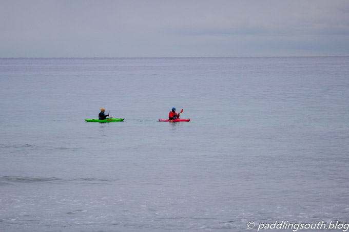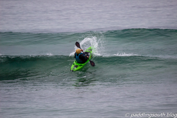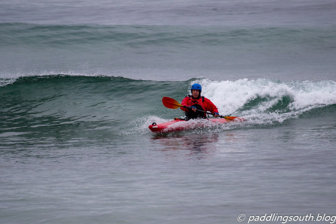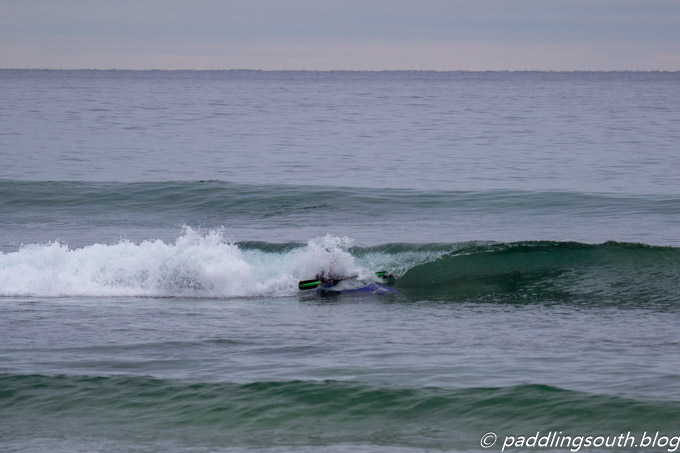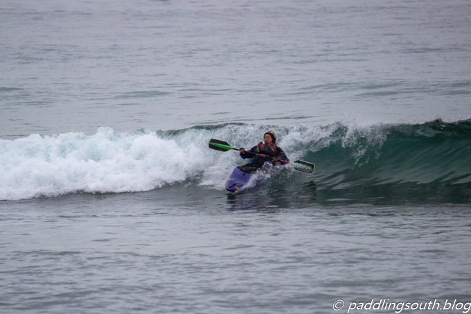 Three intrepid paddlers, wearing every bit of thermal clothing they owned, made their way down the cliff track and launched into a grey cloud covered ocean. There were nice sets of “overhead” height waves to be conquered.